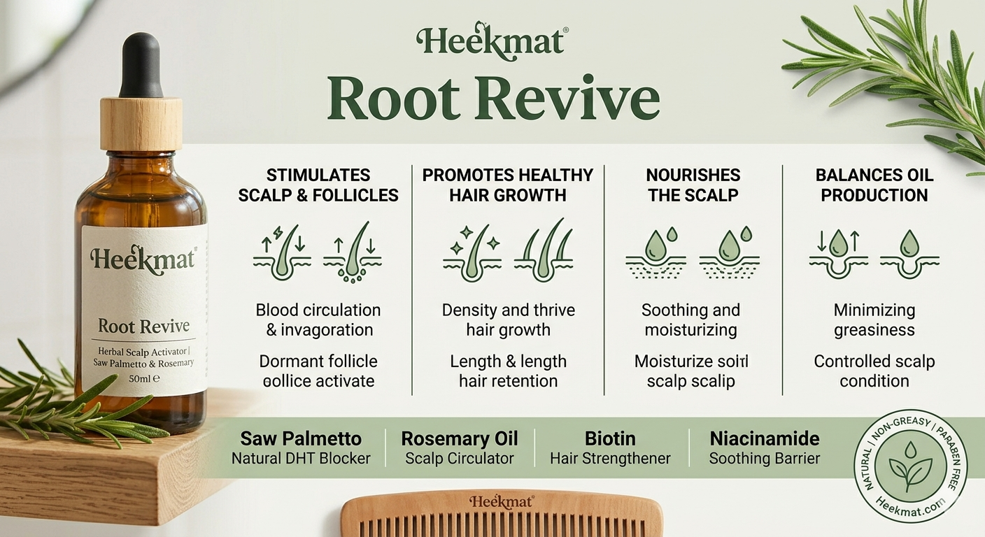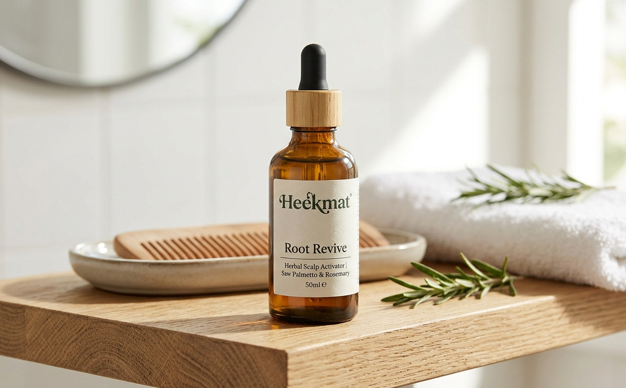 The Heekmat Effect: Uses Saw Palmetto to naturally block DHT (a hormone linked to hair loss) and Rosemary oil to improve microcirculation to the follicle.