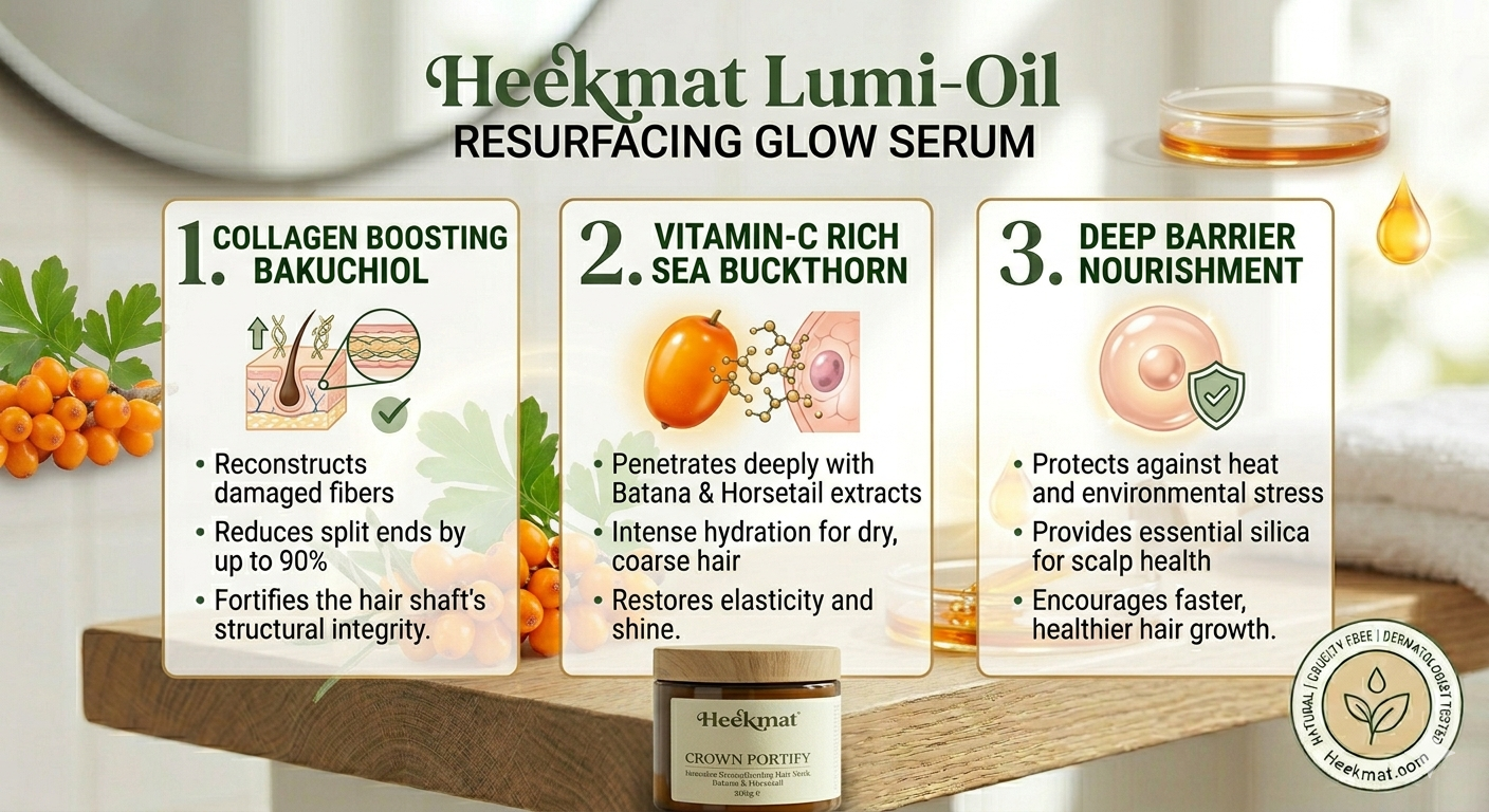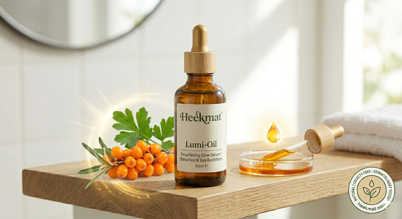• The Heekmat Effect: Bakuchiol provides the collagen-boosting benefits of retinol, while Sea Buckthorn oil delivers Omega-7 fatty acids to heal the skin barrier.